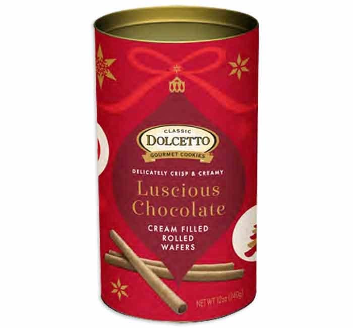 Bring indulgence to your holiday offerings with the Dolcetto Luscious Chocolate Wafer Roll Holiday Tin. Each beautifully designed 12 oz tin is filled with crisp, delicate rolled wafers generously layered with rich chocolate cream—an irresistible treat for festive moments.